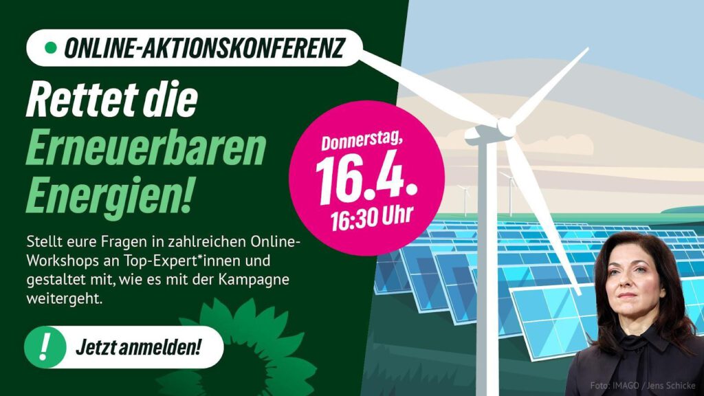 Bevor wir am Samstag demonstrieren, vernetzen wir uns online, um die Kampagne “Rettet die Erneuerbaren!” in alle Regionen zu tragen. Das ist die mit Abstand größte Aktionskonferenz, die wir Bündnisgrünen je gemacht haben. Seid dabei: